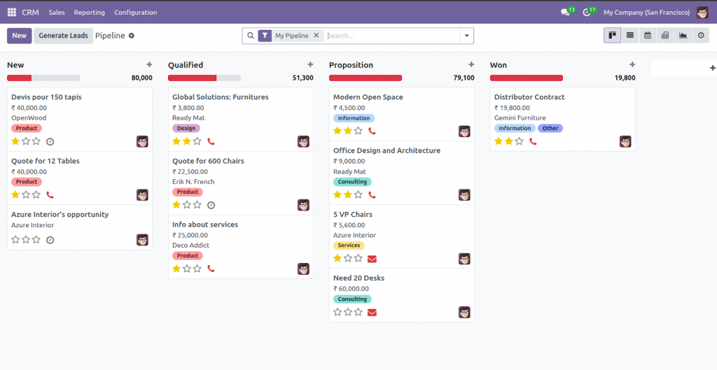 - Opportunity Stages – Managed through Kanban (New → Qualified → Proposal → Won).